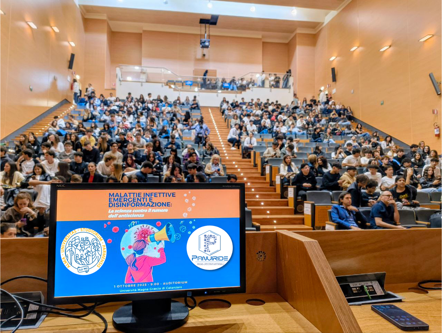 Il 29 e 30 settembre si sono svolti all’Hotel Marechiaro di Gizzeria Lido il meeting scientifico finale del progetto e la prima edizione della Panviride Drug Discovery Conference, ideata per riunire periodicamente i massimi esperti e le massime esperte nel campo della Chimica Farmaceutica antivirale. Agli eventi hanno partecipato oltre 100 ricercatori e ricercatrici e numerosi esperti ed esperte internazionali provenienti da Cina, Repubblica Ceca, Singapore, Belgio, Svizzera e da importanti centri di ricerca italiani. Il 1° ottobre i lavori si sono conclusi all’Auditorium dell’Università Magna Græcia, dove si è svolta l’iniziativa di divulgazione No More Fake News, dedicata alla corretta informazione scientifica e alla lotta alla disinformazione in ambito sanitario. L’appuntamento ha coinvolto oltre 400 studentesse e studenti e le principali società scientifiche nazionali.